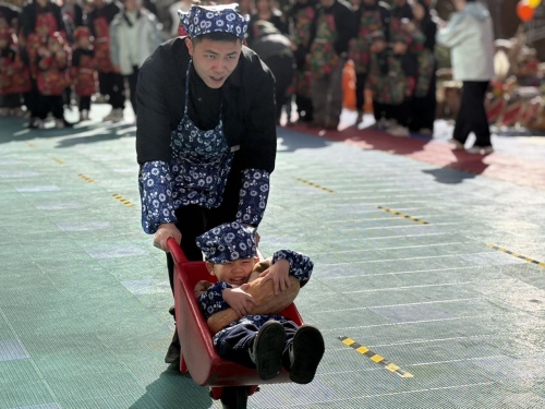 活动现场,爸爸们化身“农耕能手”,身着蓝印花布服饰,小心翼翼推着红色独轮车,车里坐着裹着同款花布头巾的宝贝,怀里还抱着象征“丰收粮食”的道具。孩子们晃着小脚丫,笑得合不拢嘴;爸爸们则放慢脚步,稳稳掌控方向,在赛道上一步步向前。独轮车轱辘滚动的声响,搭配孩子们清脆的笑声,勾勒出一幅温馨的亲子农耕画卷。