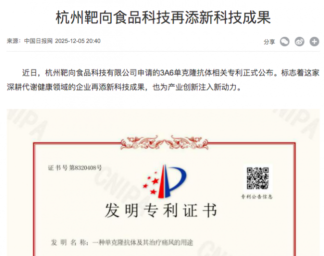 杭州靶向食品的野心,远不止于一款益生菌产品。作为国家生物重点项目的转化平台,其研发团队已将触角延伸至代谢综合征的全领域:2025年底公布的3A6单克隆抗体专利,瞄准痛风炎症核心因子IL-1β,为难治性痛风提供了新的生物治疗思路。2026 年,企业进一步联合浙江省台州中心医院等多家三甲医院,启动真实世界研究,聚焦 “尿酸盐结晶阻断” 这一临床痛点,探索单克隆抗体与益生菌协同干预的新路径,目前相关研究已进入患者招募与数据收集阶段,有望为痛风慢性期的精准管理提供更高效的方案。