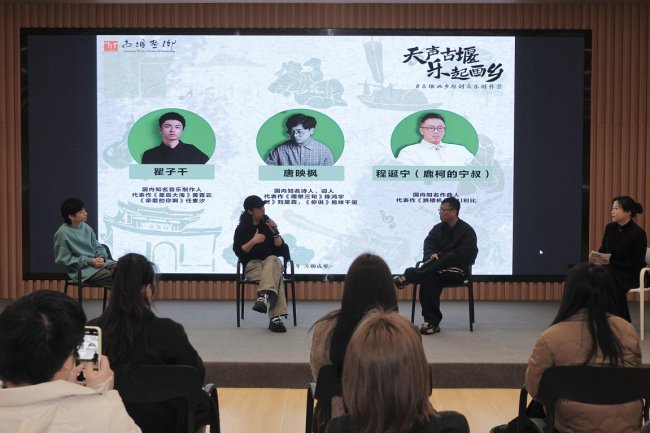 2月6日,活动进入专业赋能与成果打磨的关键阶段。上午,古堰画乡艺术中心多功能厅举办的音乐大师课和产业沙龙,知名词作者唐映枫老师以《声音的在地转译:采样、氛围与歌词创作中的文化表达》为主题,结合《儿时》《理想三旬》等代表作,分享了诗歌化表达、声音采样、氛围营造等创作技巧,生动讲解如何用现代音乐语言呈现地域元素;随后的产业沙龙中,唐映枫、瞿子千、程诞宁等嘉宾围绕“听见风景:音乐如何塑造与传播目的地个性”展开深入探讨,从作品传播路径、版权运营及文旅品牌结合模式等方面建言献策,为创作成果的后续转化提供了清晰方向。